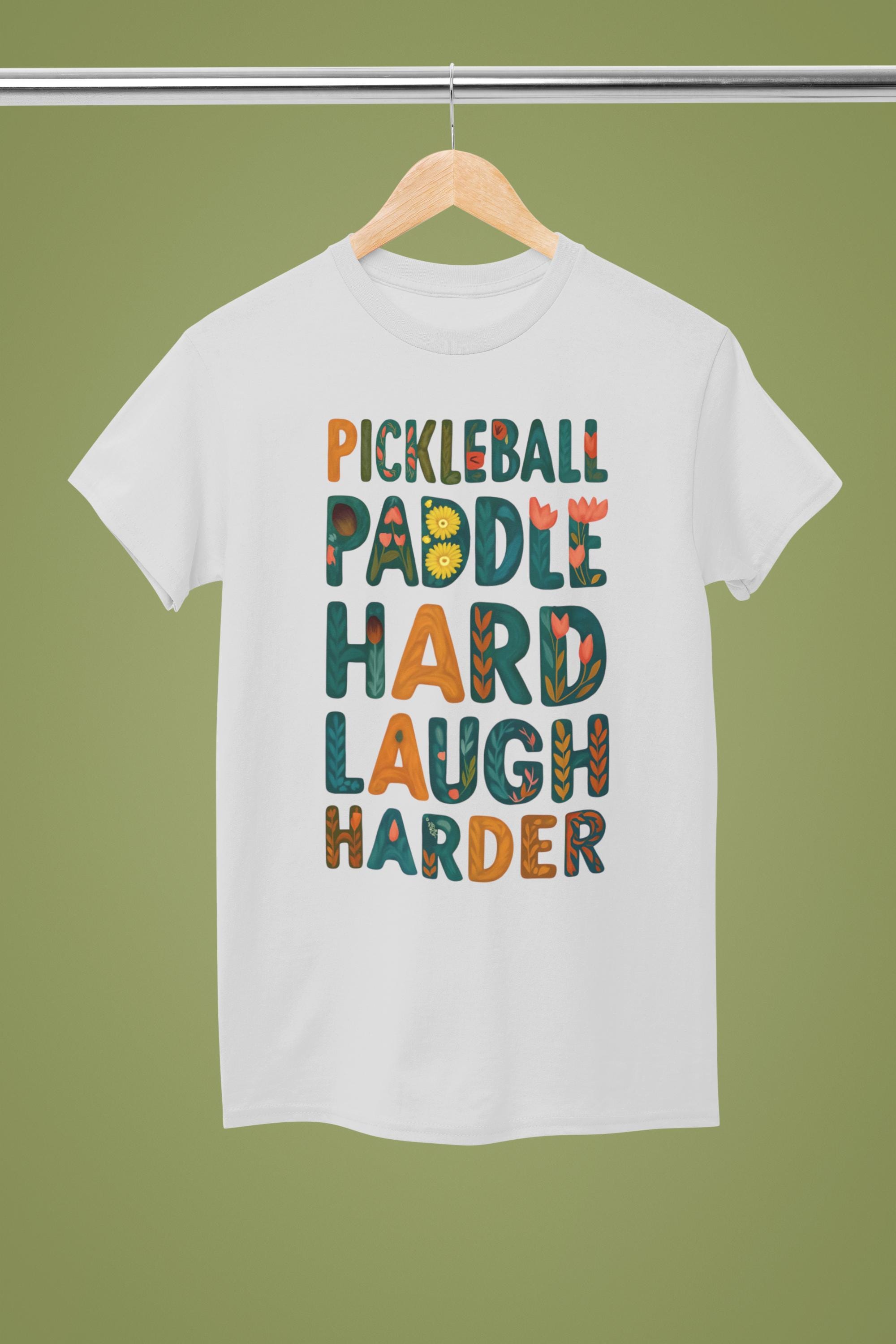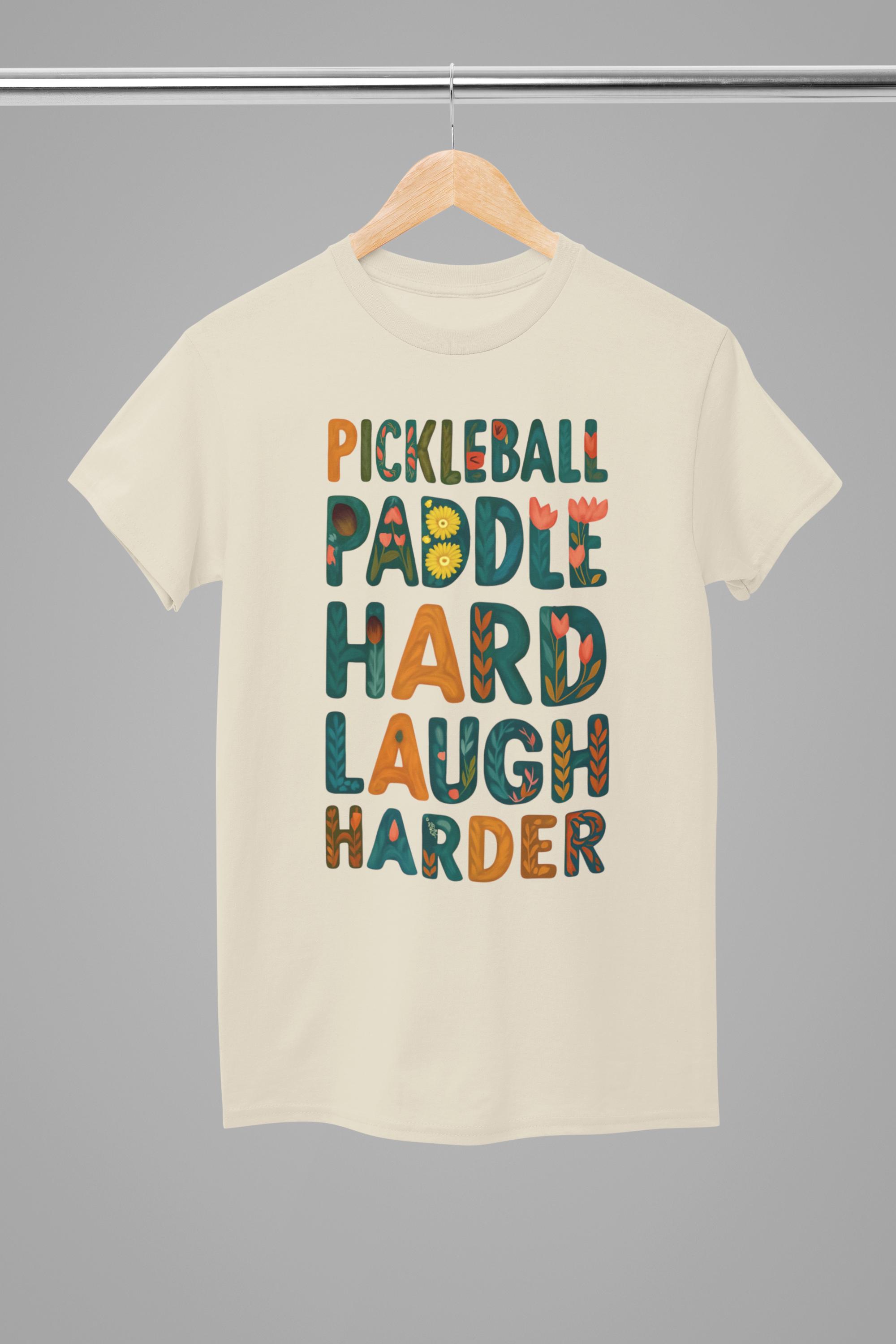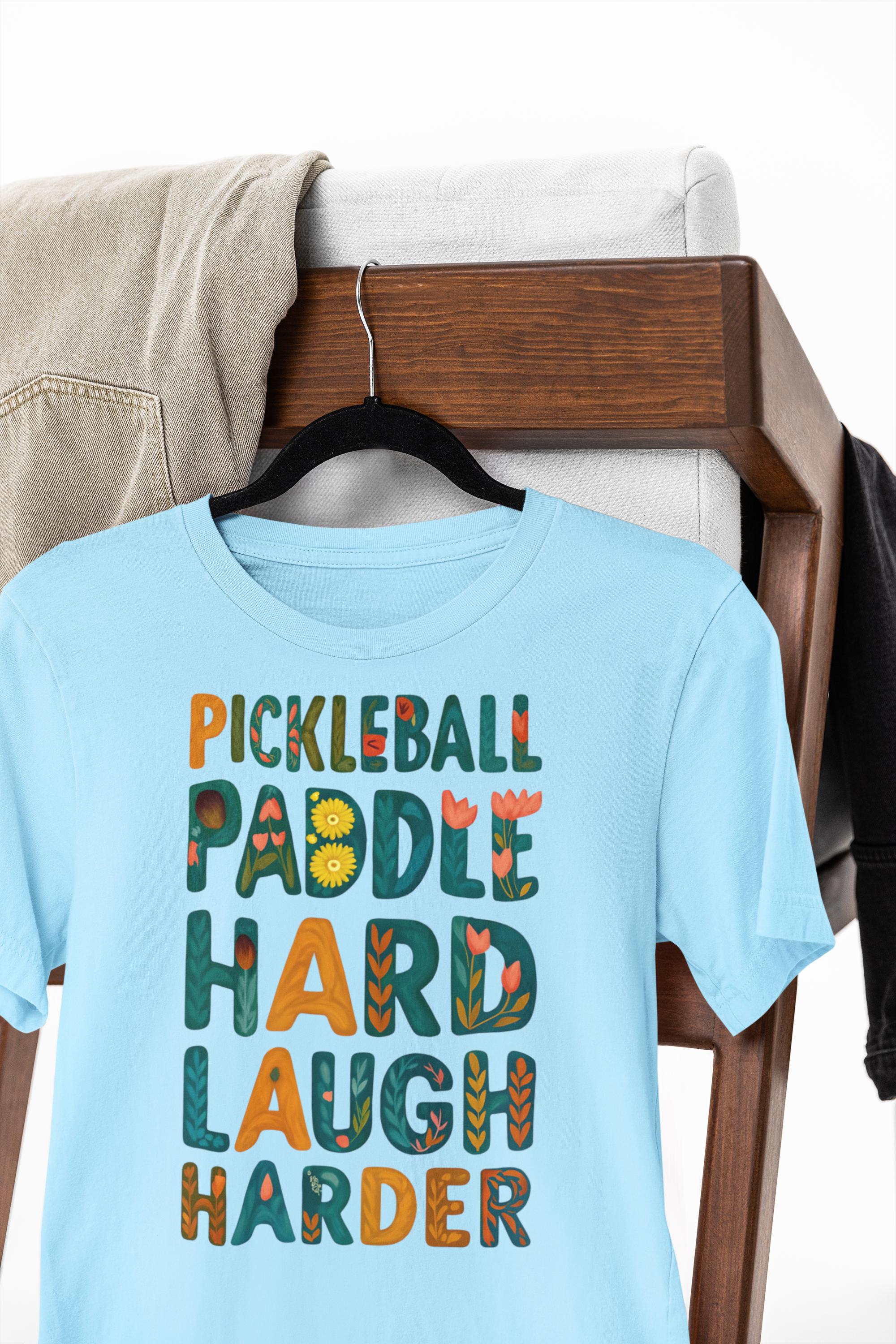 Pickleball T-shirt - Bring the fun to the court with this colorful "Pickleball Paddle Hard Laugh Harder" graphic tee — perfect for players who know that Pickleball is serious business... but not too serious.