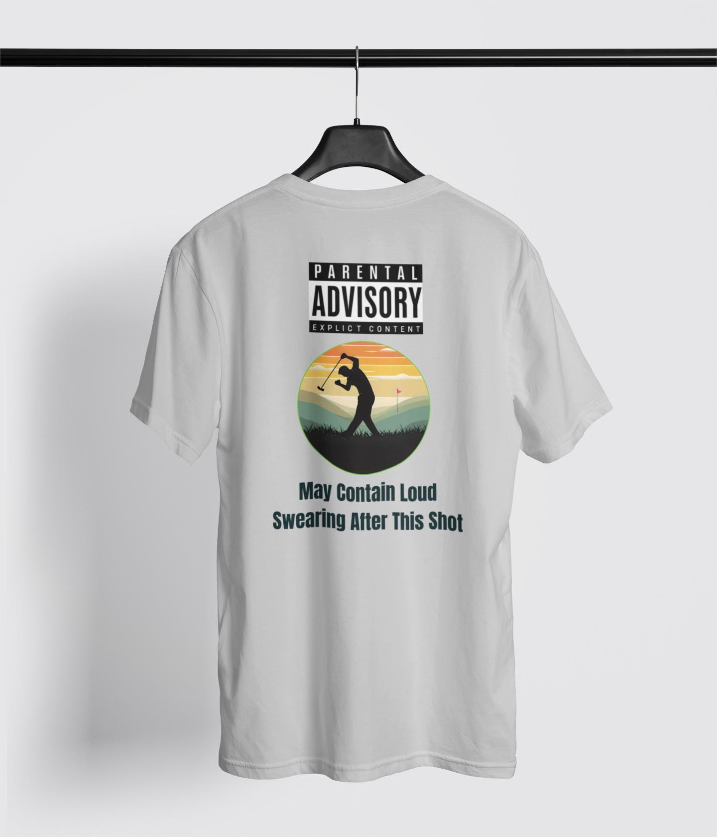 Introducing our funny golf T-shirt featuring a bold "Parental Advisory" warning and the hilarious message: "May Contain Loud Swearing After This Shot." Perfect for golfers who take their game seriously—but not too seriously.