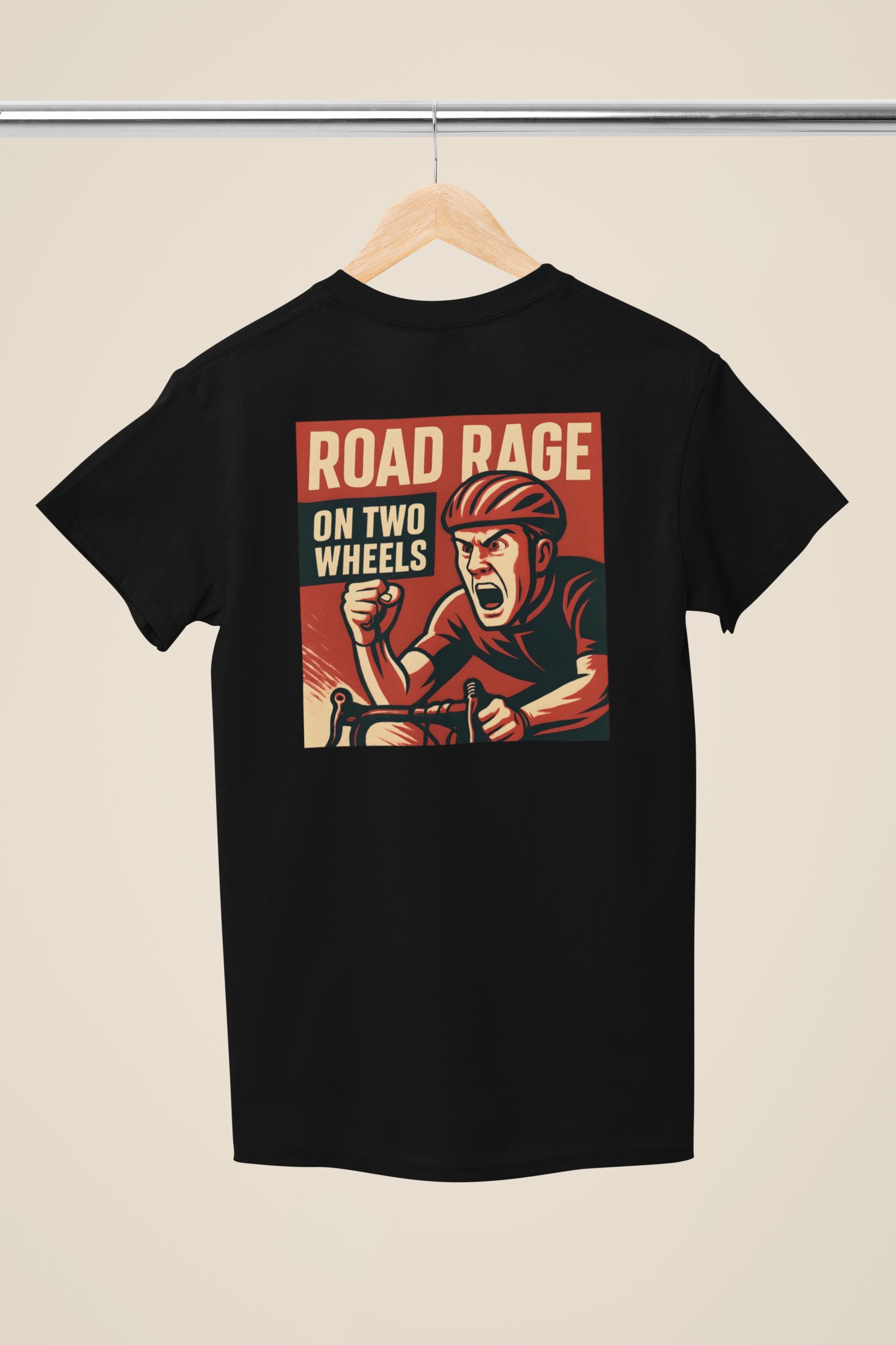 Funny cyclist vintage t-shirt with 'road rage on two wheels' logo. Perfect for cyclists with a sense of humor looking to add a playful touch to their wardrobe. Great for casual wear or as a gift for cycling enthusiasts.