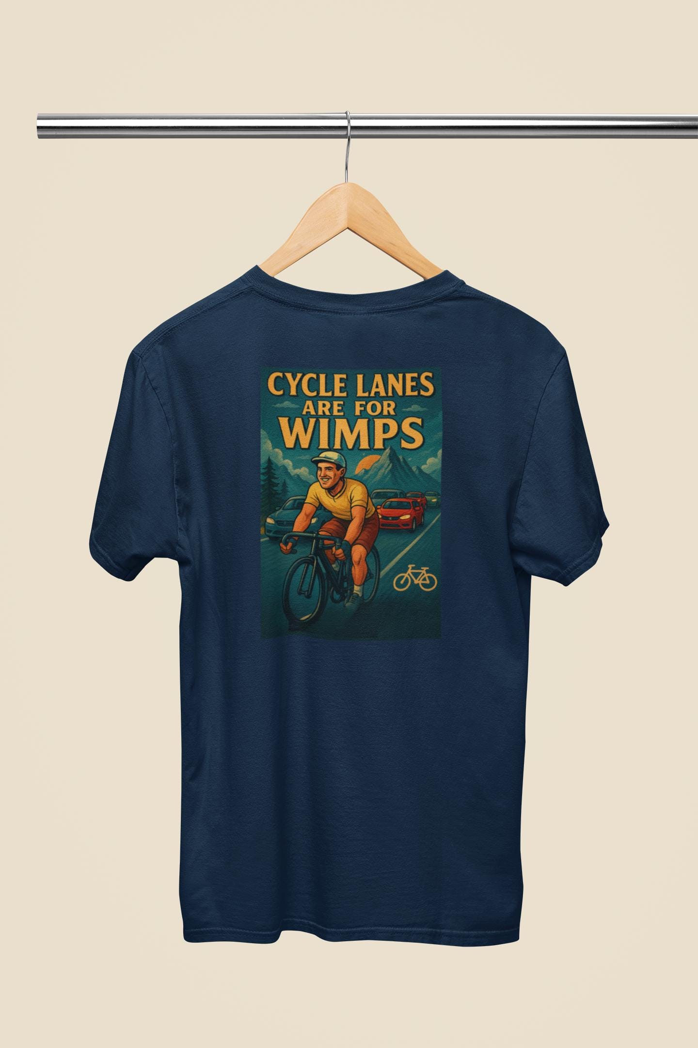 Stand out on the street and the saddle with this hilarious “Cycle Lanes Are for Wimps” T-shirt! Featuring a bold retro-style illustration of a confident road cyclist causing a traffic jam, this tee is perfect for cyclists who ride with attitude and aren’t afraid to take the lane. Whether you’re a daily commuter, weekend warrior, or just love poking fun at car culture, this funny bike shirt is sure to turn heads.