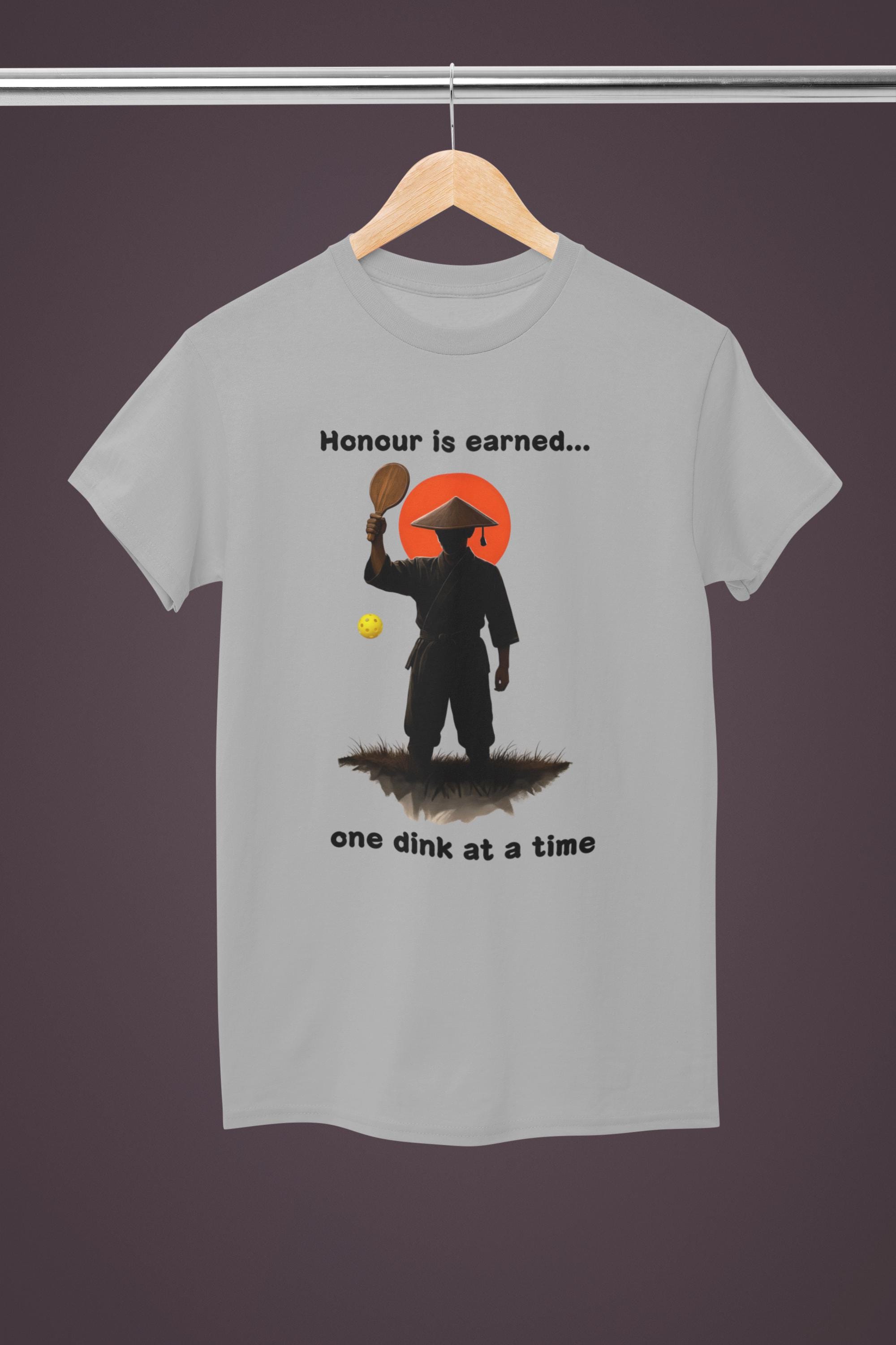 Funny Pickleball T-shirt - Channel your inner warrior on the pickleball court with this hilarious and unique t-shirt featuring a noble samurai and the battle-ready slogan: "Honour is earned... one dink at a time."