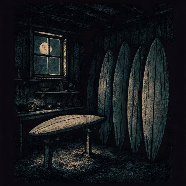 Oversize Surf T-shirt - Salute the soul of the surf industry with Ghost Shaper, a tee paying homage to the quiet artists of the shaping bay. Vintage-style graphics show a moonlit shed stacked with surfboards — mysterious, nostalgic, and effortlessly cool.