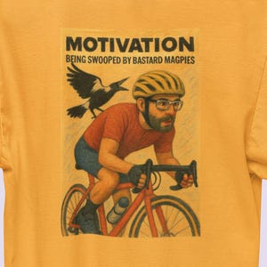 Featuring original distressed artwork of a cyclist under attack by Australia’s feathered missiles, this tee is perfect for riders who’ve survived — or are still surviving — magpie season. The vintage print gives it that well-worn, battle-tested look every swooping-season warrior deserves.